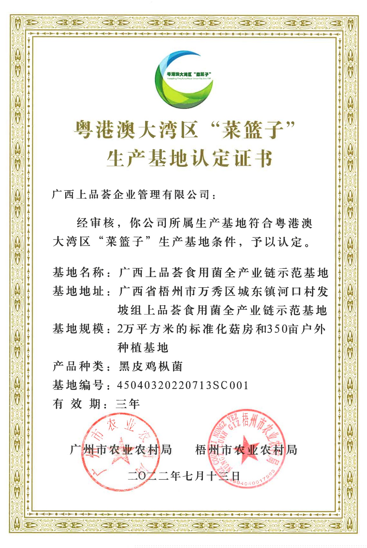粵港澳區“菜籃子”生產基地認定證書